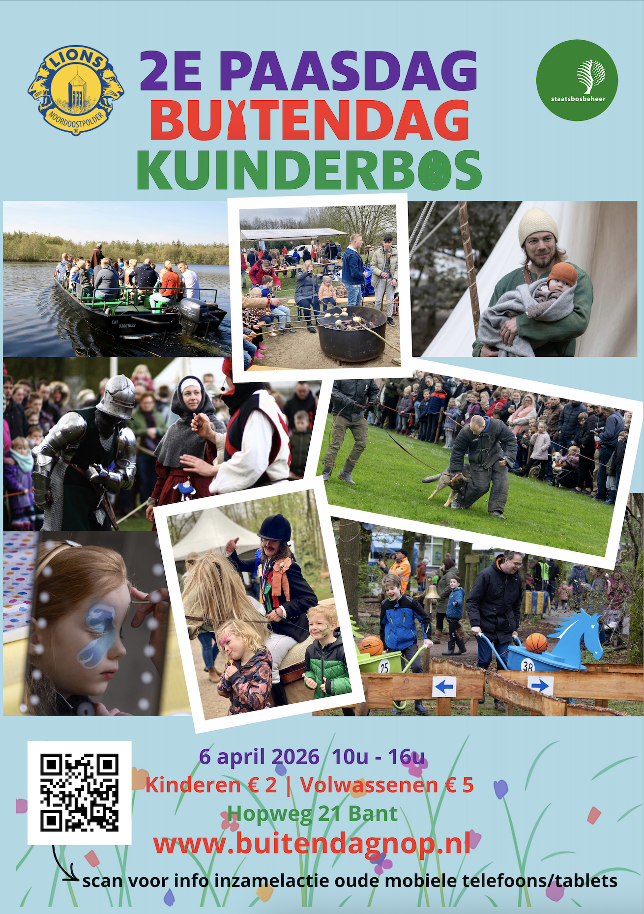 Op Tweede Paasdag op 6 april 2026 organiseert Staatsbosbeheer samen met de Lionsclub Noordoostpolder opnieuw de ‘Buitendag Noordoostpolder’ in het Kuinderbos bij Natuurkampeerterrein de Veenkuil aan de Hopweg 21 in Bant. Dit jaar zijn er tijdens de Buitendag weer diverse nieuwe activiteiten. Iedereen is welkom van 10.00 uur tot 16.00 uur.